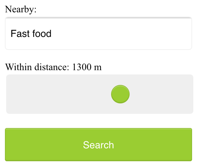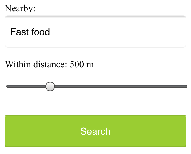 1<form method='post' action='data:text/plain, Form submited.' oninput='result.value=distance.value'> 2 <p>Nearby:<br><input type='text' placeholder='restaurants, ATM'></p> 3 <p> 4 Within distance: 5 <output name='result' for='distance'>100</output> 6 m 7 <br> 8 <input name='distance' type='range' value='100' max='2000' min='100' step='100'> 9 </p> 10 <p><input type='submit' value='Search'></p> 11</form>